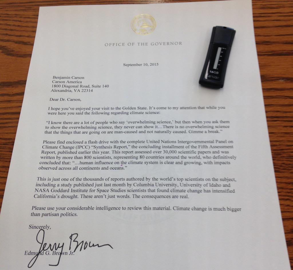 Brown wrote Carson a letter on official Governor of California stationery, and enclosed a thumbdrive containing the most recent report of the UN’s Intergovernmental Panel on Climate Change.