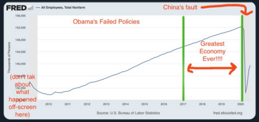 Matt Yglesias annotates a Federal Reserve chart of job growth to sum up the Trump economic narrative: