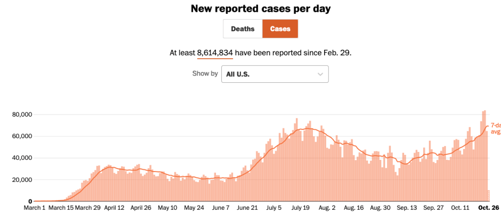 The daily new-case numbers hit a new high Friday. The exact numbers vary depending on things like when you change over to a new day, but The Washington Post claimed 82,920 cases Friday, while The New York Times recorded 85,085. In both systems, Thursday had just missed setting the record established in July, and Saturday’s total was either just above (WaPo) or just below (NYT) Friday’s.