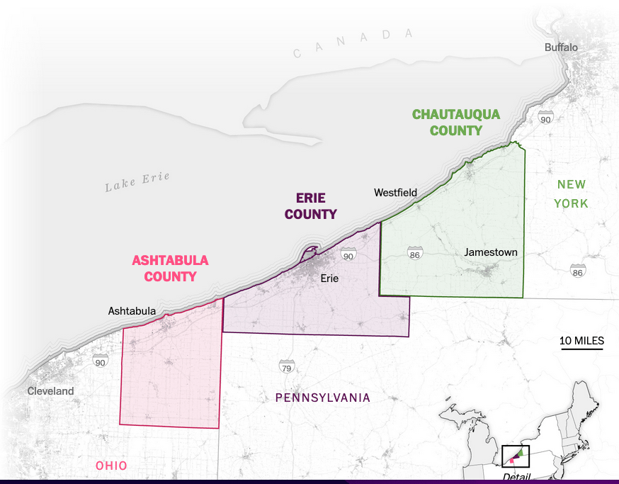 A second WaPo article looks at the influence of politics: It compares three demographically similar counties on the shore of Lake Erie: one in red Ohio, one in purple Pennsylvania, and one in blue New York.