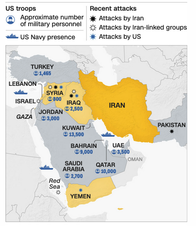 The war continues to ooze outward, with a rising risk that the US will get drawn into a larger conflict with Iran. A drone hit a US outpost in Jordan early Sunday morning, killing three US soldiers and wounding more than 30. BBC summarizes the situation: