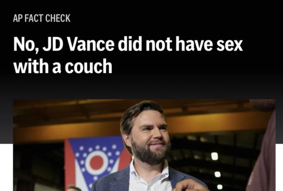 Largely because of that specific referencing, the rumor began to take off — I even believed it myself at first — to the point that it needed to be debunked. So AP published a fact-check (since removed) which it headlined: “No, JD Vance did not have sex with a couch.”