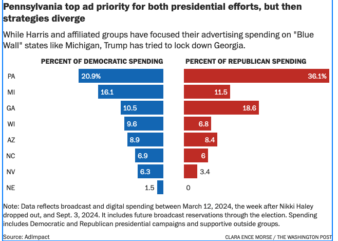 Campaign strategies. The two campaigns are not approaching the battleground states equally. The Trump campaign is focusing its spending on a narrow path to 270 (or perhaps only 269), believing it mainly needs to win Georgia and Pennsylvania. (So far, they do not seem to take seriously the possibility of losing North Carolina.)