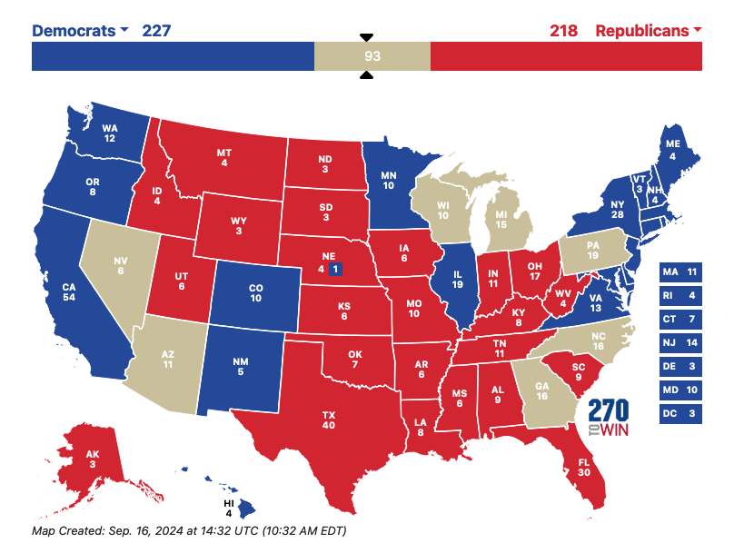 Some of those “uncertain” states have a definite lean, and would only go the other way in a national rout. So an average of recent polls has Harris up 6.7% in New Hampshire and 8.0% in Virginia, while every recent poll of New Mexico has Harris up at least 5%. Trump is up 4.3% in Florida, which is hardly insurmountable, but still significant. If you allocate those votes, Harris is ahead 225-217.