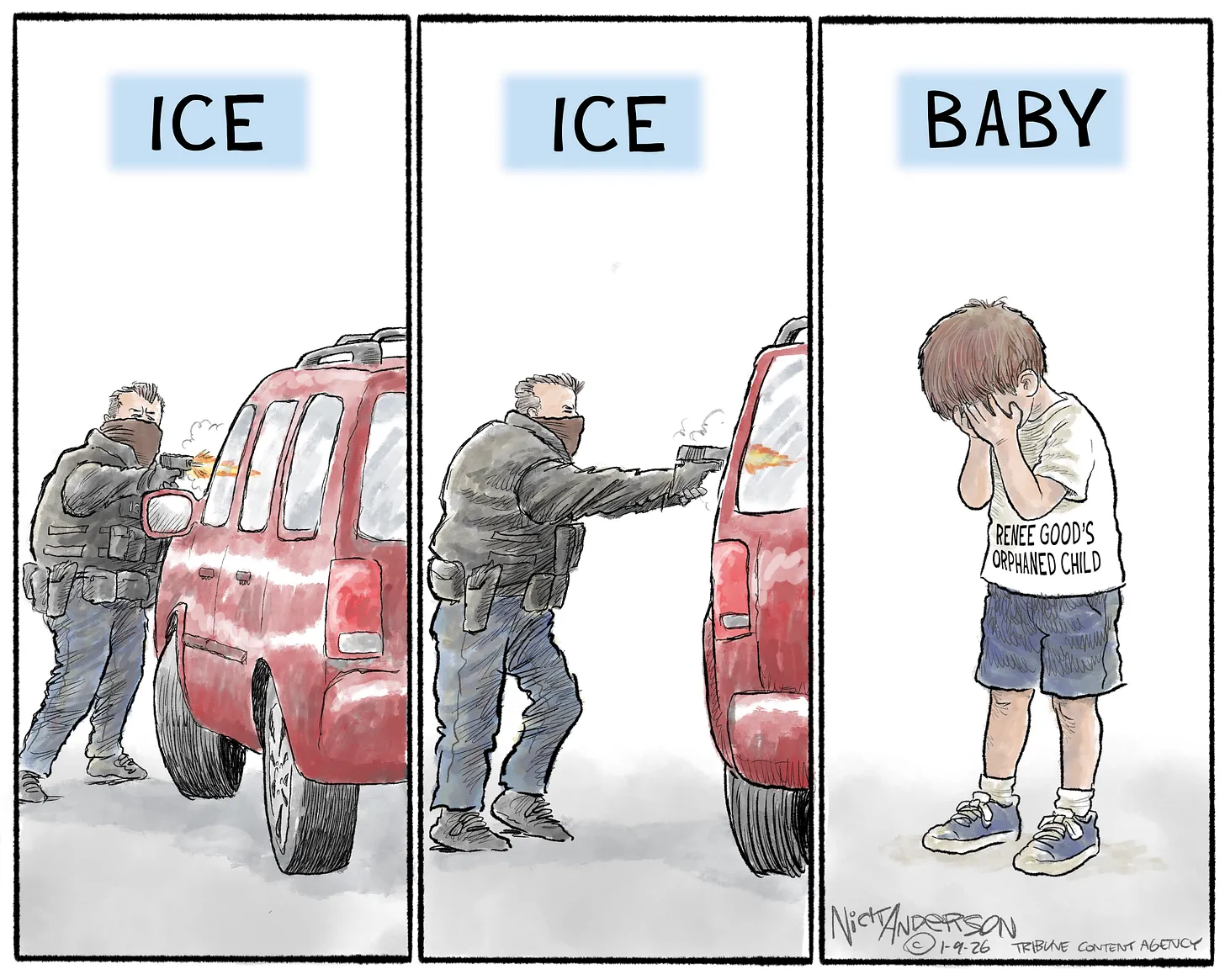 Wednesday in Minneapolis, ICE agent Jonathan Ross shot American mother Renee Good three times, killing her. There is so much to be upset about here, it’s hard to pick a focus. So I’ll start by listing a few and justify them later.