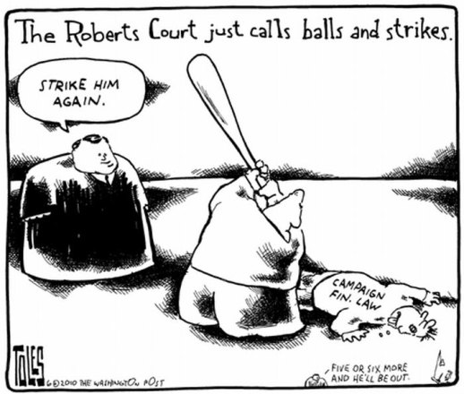 [3] Suppose, say, that Senator James Inhofe is the voice of climate-change denial in the Senate and uses his position as chair of the Environment and Public Works Committee to block any effort to shift America away from its dependence on fossil fuels. And then suppose that his top campaign contributions all come from producers or consumers of large quantities of fossil fuels. The Supreme Court sees no problem there that the law might want to address; quite the opposite, it sees any law that might get in the way of that arrangement as a violation of free speech.