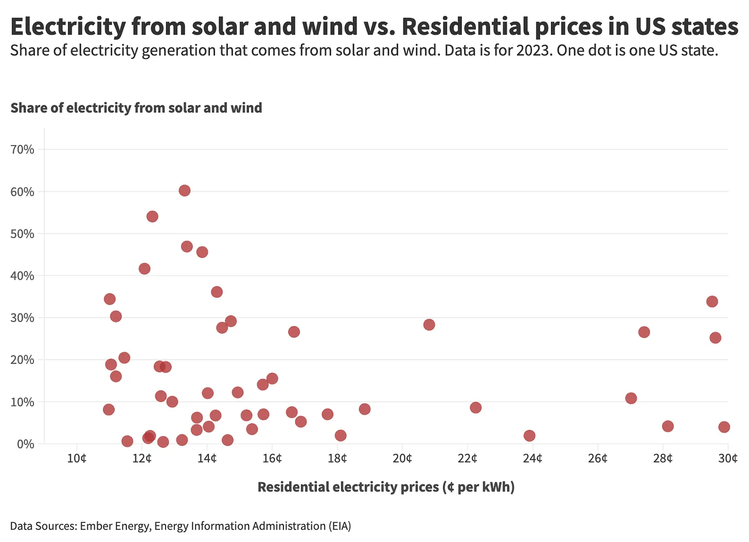 End-to-end, this post is nutty. Electricity costs are rising because of demand, especially demand for computation related to AI and cryptocurrency mining. The Sustainability By Numbers blog ran the state-by-state numbers and found no correlation, positive or negative, between sustainable energy and prices.