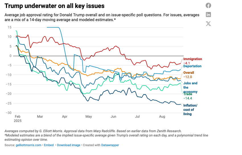 But things don’t work that way any more, largely because Trump barely needs Congress. If you rule by executive order rather than legislation, use the full power the Supreme Court has granted the unitary executive, don’t worry too much about the letter of the law, and dare the courts to stop you, you don’t need public support. And across the board, Trump doesn’t have it.